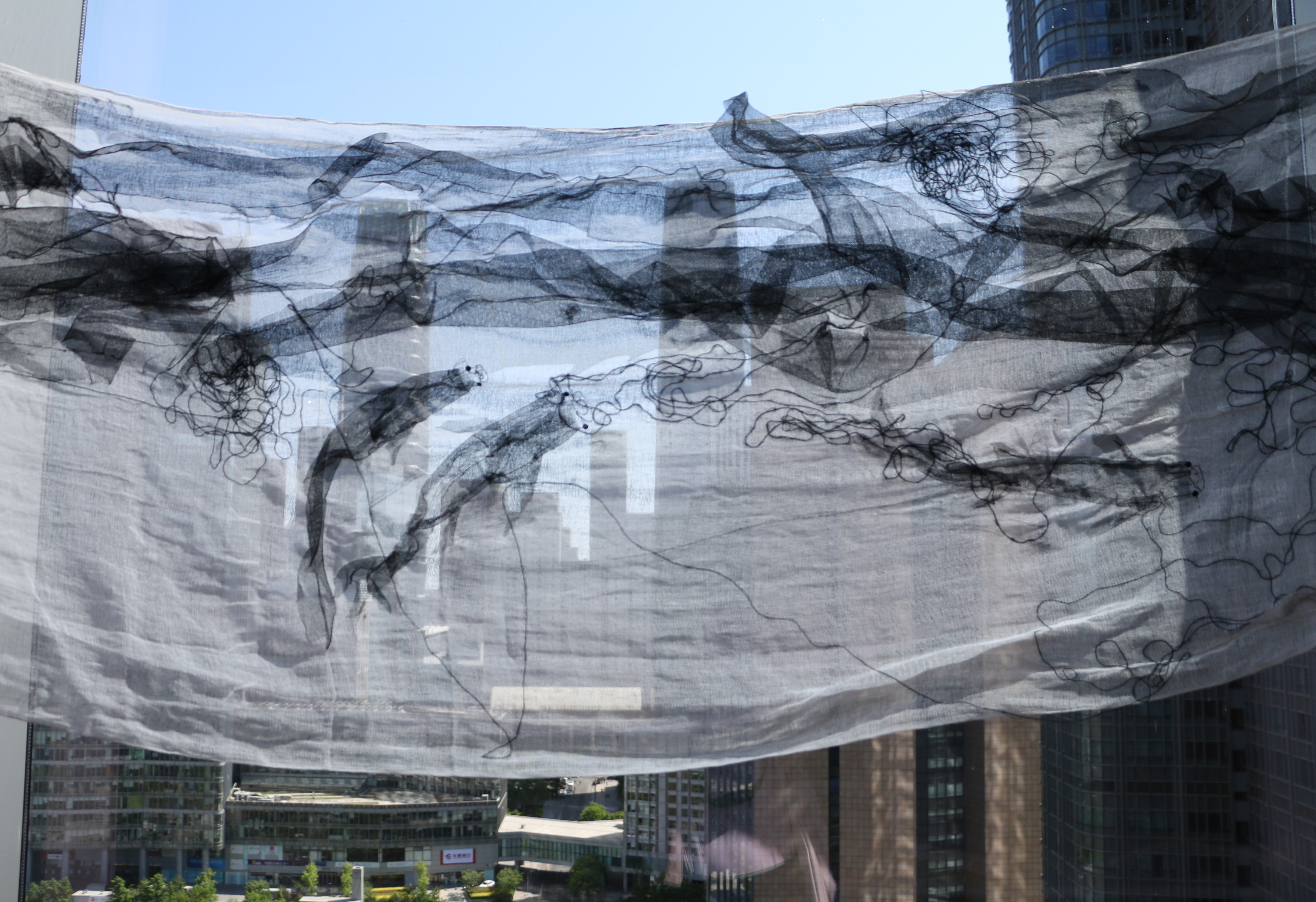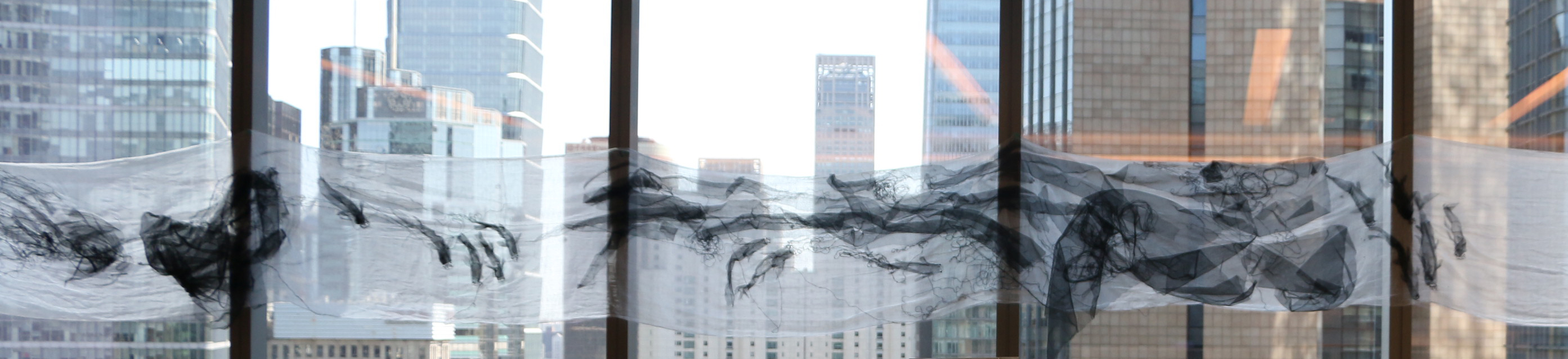 My research project investigates the relationship between fiber art and Chinese ink painting in contemporary art practice. My research aims to use fiber material to express ink painting in order to apply the change of aesthetic and give tradition a new order. My studies focus on how to use contemporary-artistic imitation of traditional Chinese painting with composite materials. My work inspires by Xu Bing’s Background Story and Qi Baishi’s ink paintings, using gauze, yarn and screen cloth to reconstruct elements in traditional ink paintings and also add new elements in it. By expanding the size and displaying my work in a contemporary manner, I change the original visual experience of audience looking at traditional ink painting.